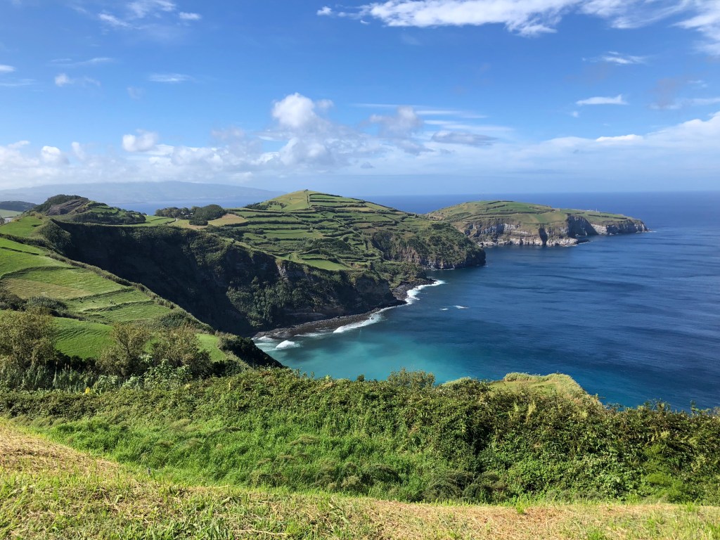 Few miradouro, breathtaking views and still lots of cows & hydrangeas later, we made it to Furnas – a town popular with the tourists d/t their hot springs and a traditional meal (you’ll hear more about that later this week). Sure enough, we didn’t have any reservations for dinner but we made some for Sunday. That also means thermal pools will wait til Sunday. Outside of the main city on the island (Ponta Delgada, where we are staying), this town has been the busiest with tourists. Luckily we found a lovely bakery that wasn’t busy – i had what the waitress called ‘salty bread’ i think she meant ‘savory’ as opposed to sweet. The menu translations can be quite interesting but i have to say my tomato & chirozo ‘bread’ was yummy! We also picked up a fresh local pinapple for breakfast tomorrow. Double YUM. Trying to get out of town/ find the hotsprings was quite challenging – we drove round & round & round & round (quite literally) in search of the hot springs until we realized that it wasn’t right in town, we had to drive up and over an small mountain to get there. Made for a good laugh & we’ll know for next time.
